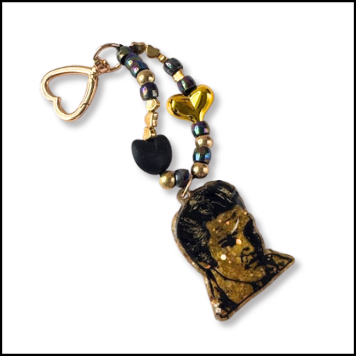 Celebrating the King of Rock & Roll! Hand cast Elvis Presley keyring/bag charm. The mould was made from original hand drawn artwork. Strung with a selection of high quality beads and finished with a gold heart keyring. Perfect gift, stocking filler.