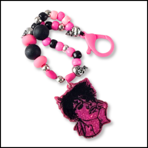 Hand cast Yungblud keyring/bag charm. The mould was made from original hand drawn artwork. Strung with a selection of high quality beads and finished with a pink keyring. Perfect gift, stocking filler.